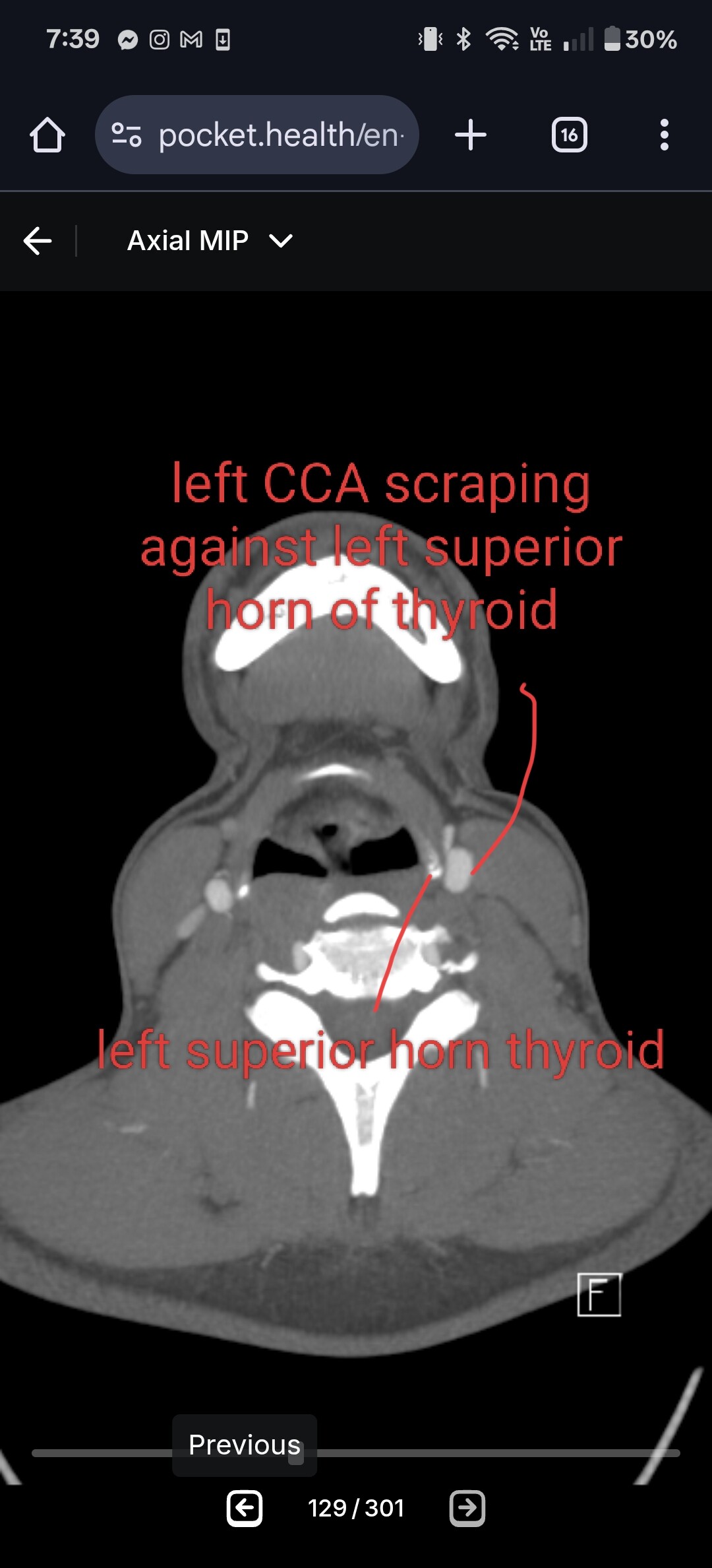 I think a CTA would be great because then you can see if your greater horns are digging into any important vascular structures, namely the ECA, ICA, or carotid bifurcation. The CTA will be helpful too in looking at your IJVs at the level of C1 (sometimes CTAs failure to capture veins with contrast though since it’s timed for contrast in the arteries)