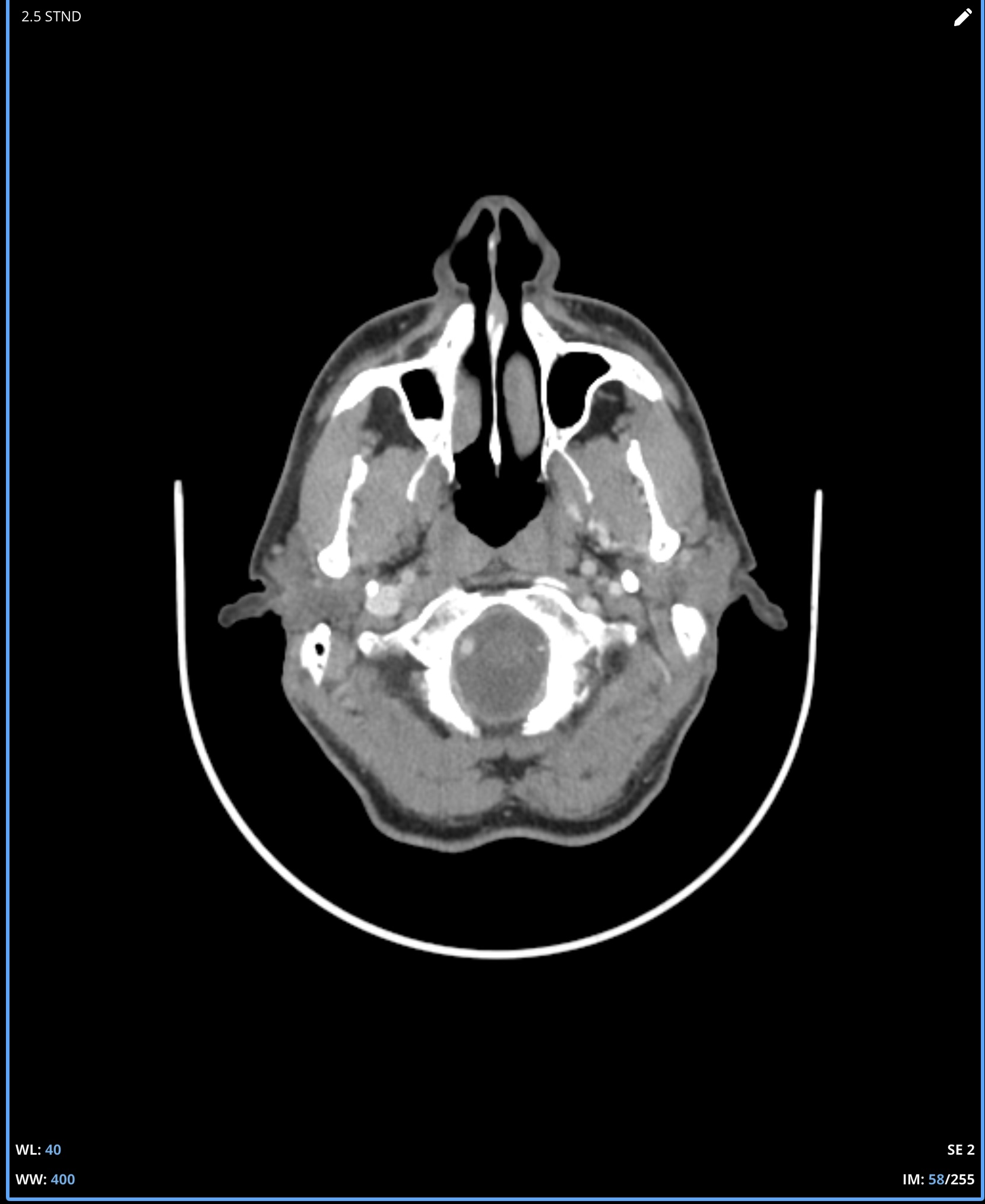 In the other two CT images, you can see the styloids really clearly- they’re quite elongated, pretty thick right at the top, and both sides look close to the C1 processes, which is a common place for the IJVs to get compressed.