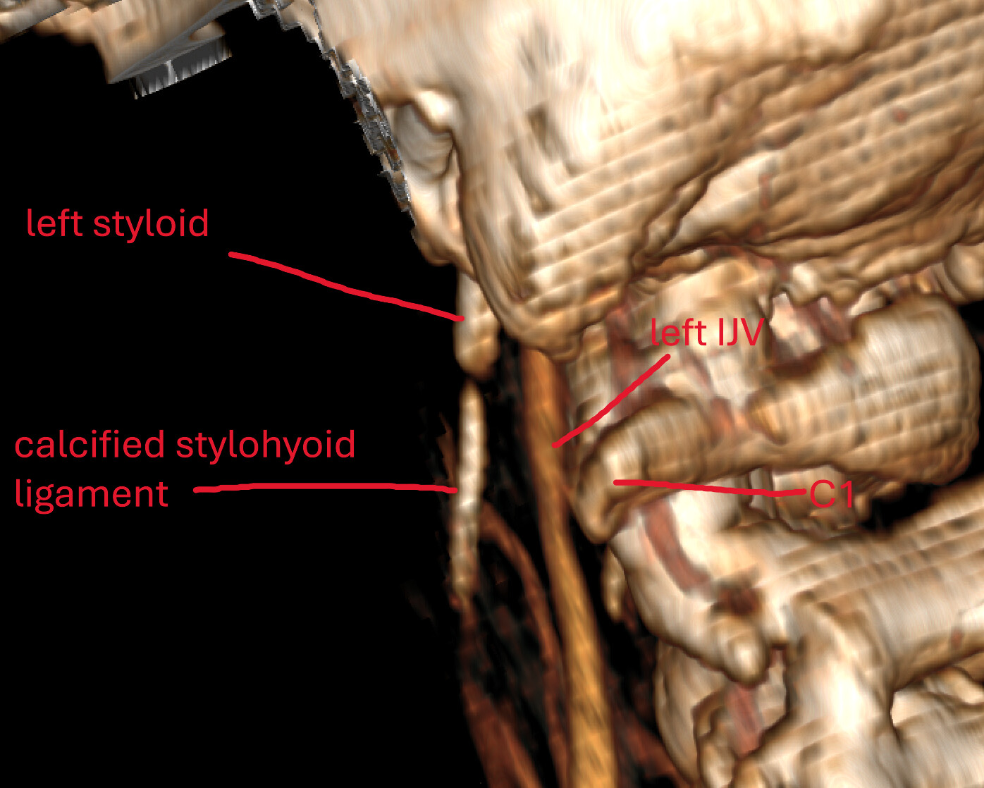 At the level of C1, both IJVs are compressed against the C1 transverse process. The styloids are quite a distance away and not contributing to the IJV compression. Sometimes when the IJVs are compressed against C1, so too are the vagus nerves that run between the IJVs and C1. Vagus nerve compression presents as heart rate and blood pressure dysregulation, sometimes vasovagal reactivity, and often times stomach issues (largely acid reflux).