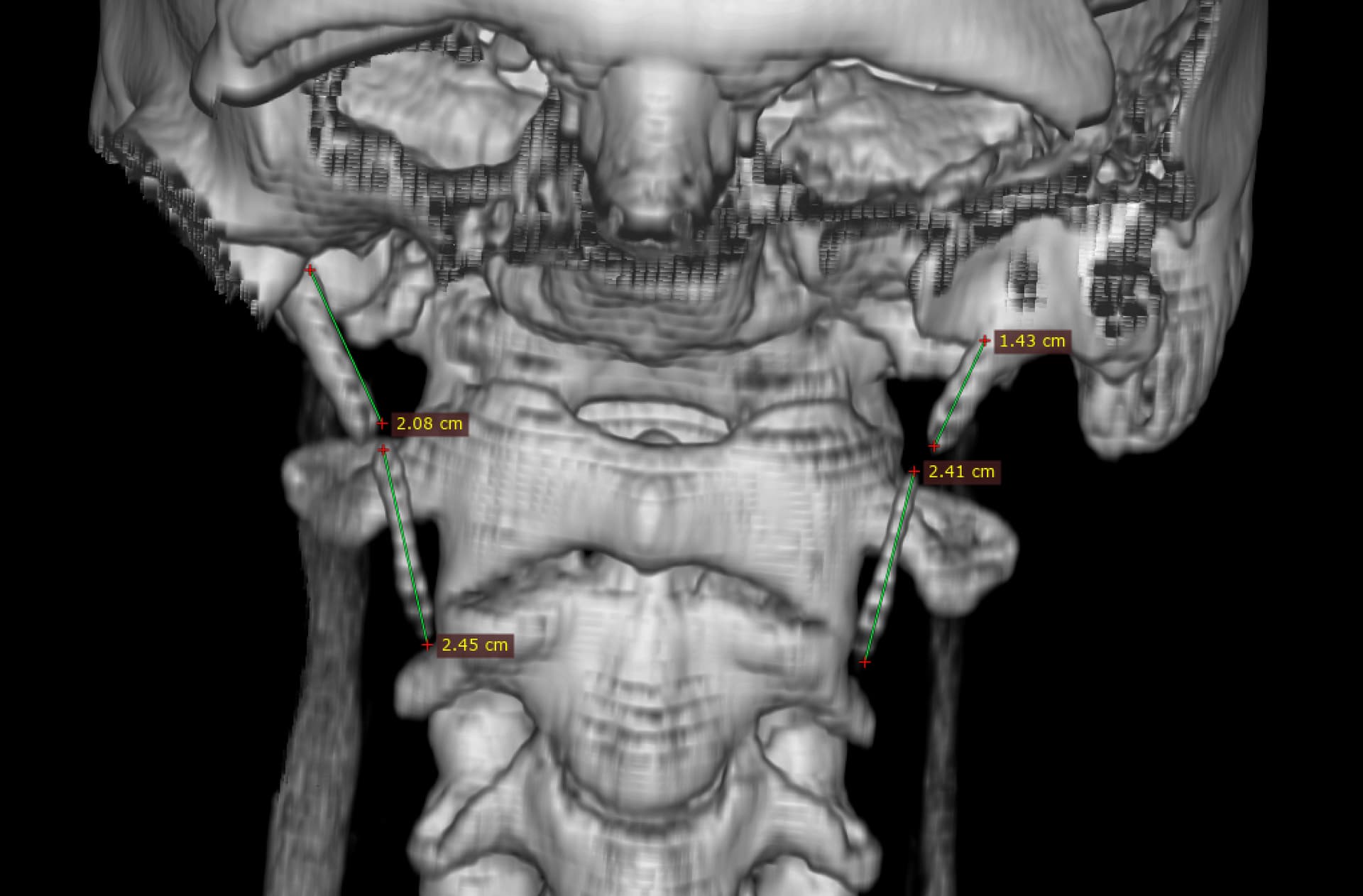I have attached 3D constructions of your styloids/stylohyoid ligament calcifications and provide rough measurement estimates.