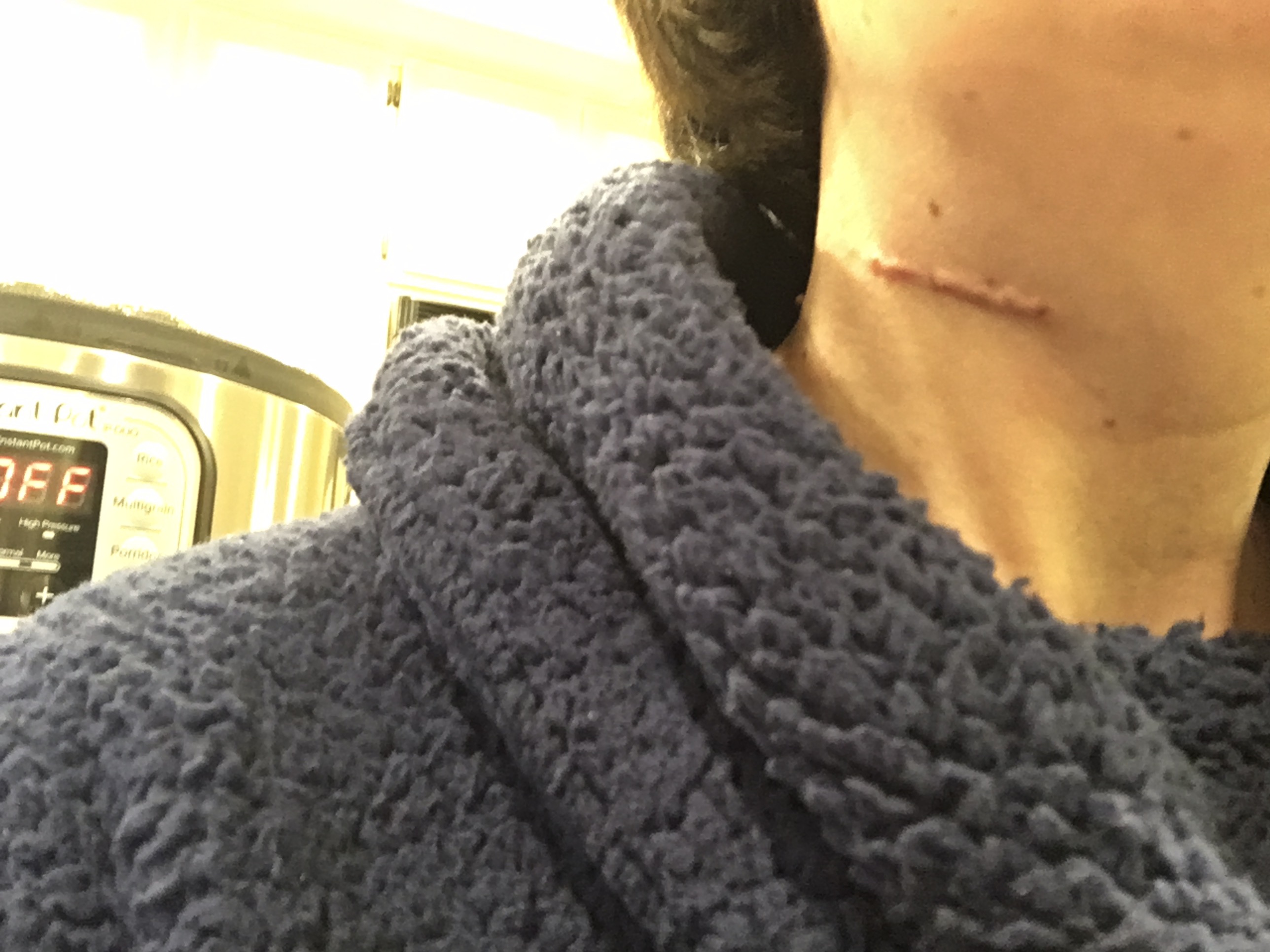 Wardrobe update: When I got the robe, I noticed Lands End made tops that were the same material as the robe. So I got one and put it on today. A gentle weaning from the robe! Here is a 3 week scar pic with the instant pot and above-mentioned pullover in the shot as well. (Bonus: it’s a turtleneck!)